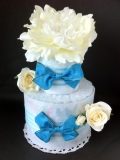 いくつあっても困らない消耗品のおむつをケーキのように仕立てた二段のおむつケーキ。 数ある出産祝品の中でも強く印象に残ることでしょう。